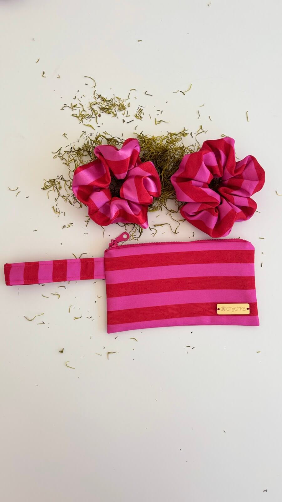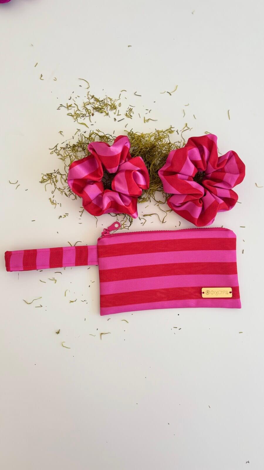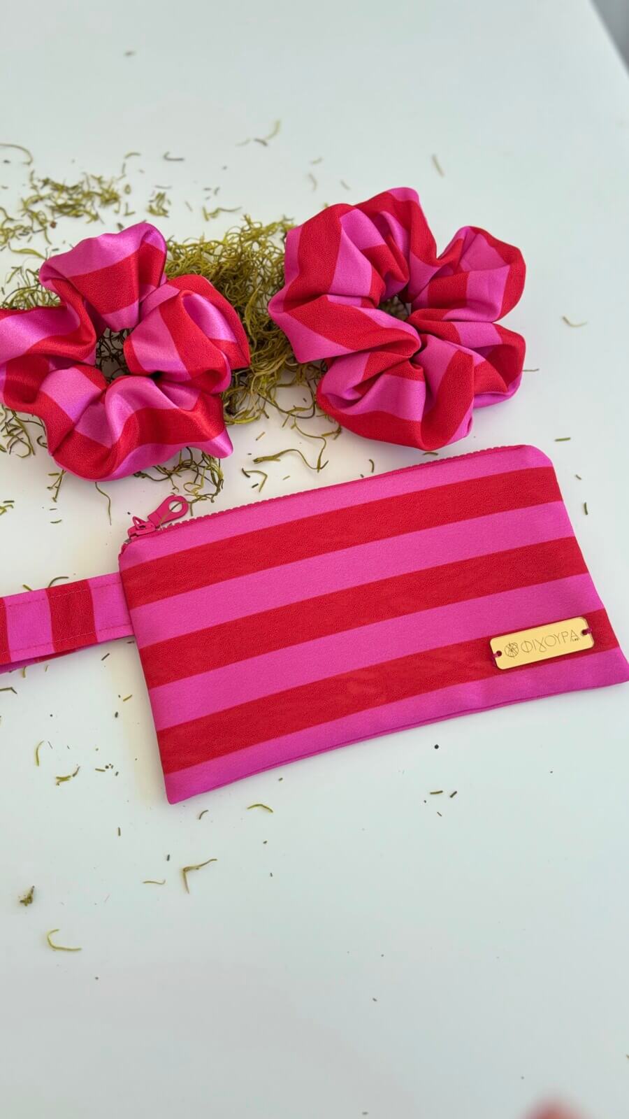 Scrunchie χειροποίητο, με ρίγες κόκκινες και ροζ. Σατέν ύφασμα.